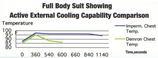 實驗條件:工作人員身穿不同防護服,以3.5英里/小時的速度在跑步機上慢跑10分鐘后測量全身防護服的溫度。藍色曲線代表通用防護服,綠色曲線代表使用Demron材料制成的防護服。