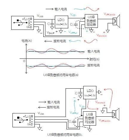 為了證明該理論,讓我們來(lái)看一個(gè)簡(jiǎn)單的電路并考慮所示的連接。該基本電路包括三個(gè)要素,一個(gè)低壓差(LDO)線(xiàn)性調(diào)節(jié)器,一個(gè)微處理USB 數(shù)據(jù)線(xiàn)接到音頻驅(qū)動(dòng)器,和一個(gè)揚(yáng)聲器,所有這些都由一個(gè)連接到某個(gè)計(jì)算主機(jī)的USB插頭供電。在本例中,USB到音頻驅(qū)動(dòng)器必須用3.3V供電。由于揚(yáng)聲器采用音頻驅(qū)動(dòng)器的輸出供電,所以音頻輸入驅(qū)動(dòng)器需要+3.3V LDO,其由USB連接器供電(+5V),這似乎可以得到一個(gè)顯而易見(jiàn)的結(jié)論,即可將它們放置在圖1(a)原理圖所示的位置。但是,在這種框架下,驅(qū)動(dòng)揚(yáng)聲器工作的電流在返回到電流源驅(qū)動(dòng)器時(shí)會(huì)產(chǎn)生一個(gè)電壓反彈,該電壓反彈會(huì)反過(guò)來(lái)作用于LDO并*終影響到USB 連接器。在本例中,把USB數(shù)據(jù)轉(zhuǎn)換為音樂(lè)的基準(zhǔn)電壓會(huì)以音樂(lè)播放的速率反彈。由于揚(yáng)聲器電感所產(chǎn)生的相移會(huì)增大誤差,這將和由于電流提升產(chǎn)生的高音量混合在一起。電壓反彈也將導(dǎo)致紋波出現(xiàn),這將降低揚(yáng)聲器發(fā)出的音質(zhì)。